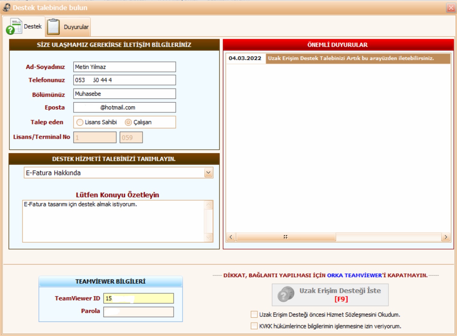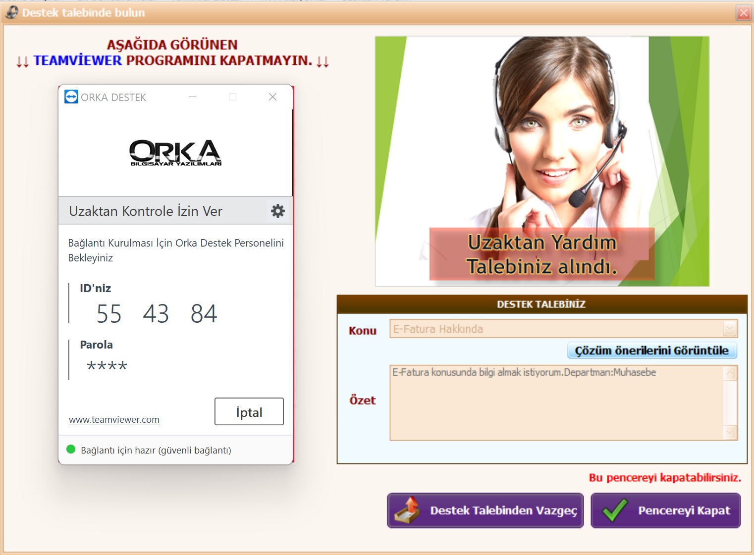 Uzaktan bağlantı programı hazırlanarak, sizin TeamViewer ID bilgileriniz otomatik olarak alınarak, Talep ettiğiniz konu Uzak Erişim Departmanına bildirilecektir.